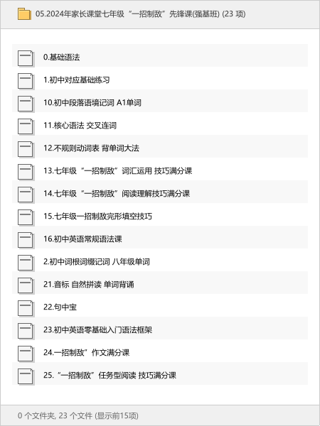 本次分享的资源是七年级英语“一招制敌”先锋课全套内容,涵盖了从基础语法、词汇记忆到阅读写作的满分技巧!
