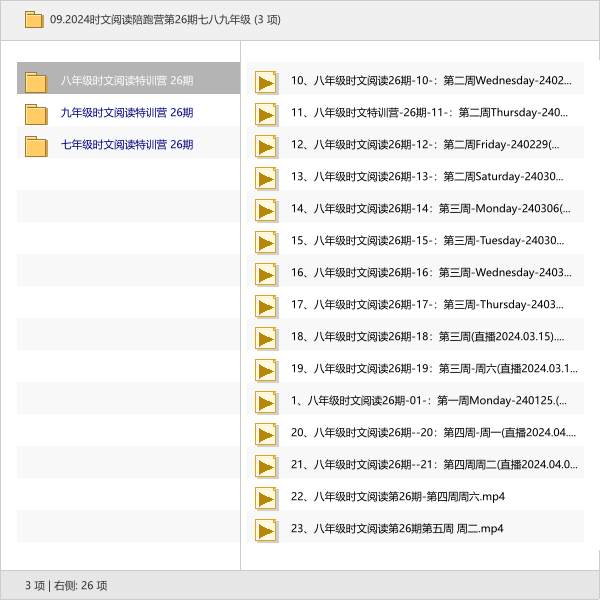 本次分享的资源是「2024时文阅读陪跑营第26期」,包含七、八、九年级的全套内容!
