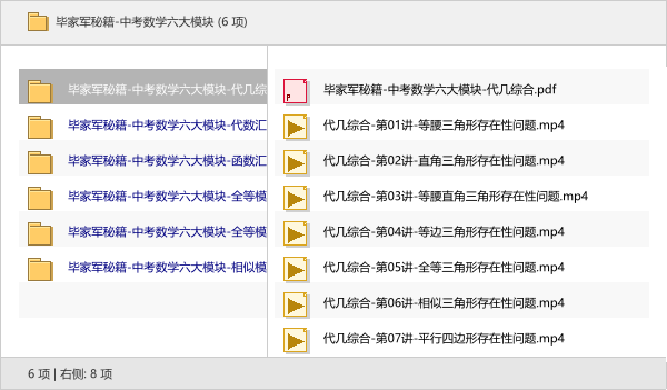 本次分享的资源是《毕家军秘籍-中考数学六大模块》,它把中考数学最核心的代几综合、代数、函数、全等与相似模型都系统梳理好了!